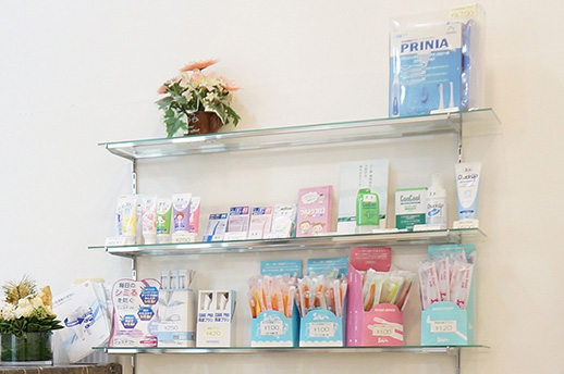 お子様向けのフルーツ味付きの歯磨き粉や、歯間ブラシ、音波電動歯ブラシなど、当院おすすめの各種口腔ケアグッズを取りそろえております。